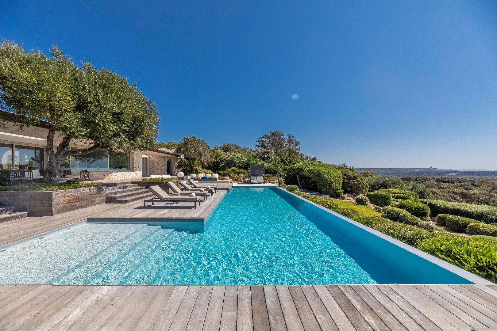 Depuis son parc d’oliviers séculaires, cette maison de luxe à Bonifacio porte son regard majestueux sur la cité historique de Bonifacio.